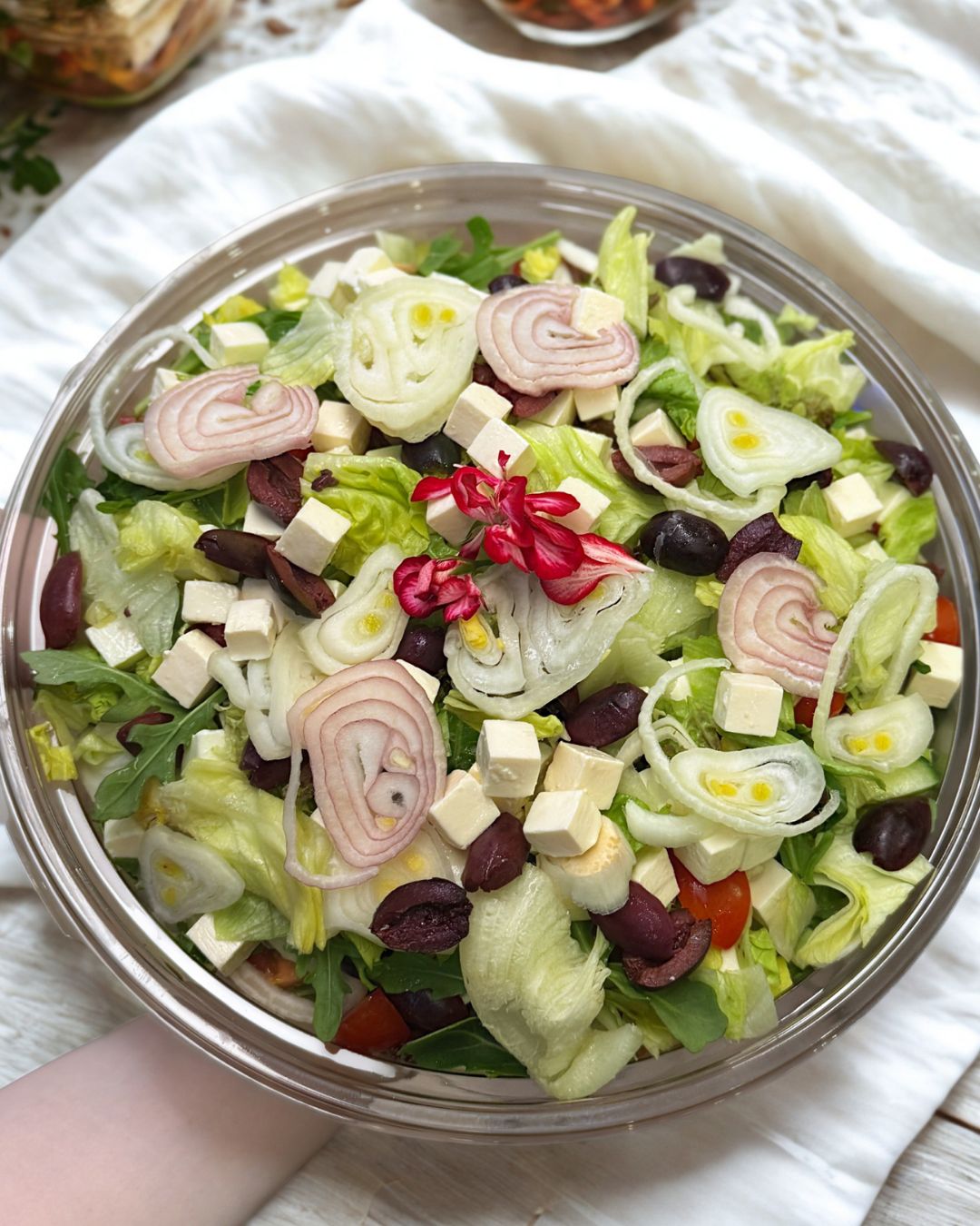 Salladen innehåller Sallad, gurka, tomat, lök, oliver, feta. Säljs per kilo. Välj önskad mängd i rullgardinsmenyn.