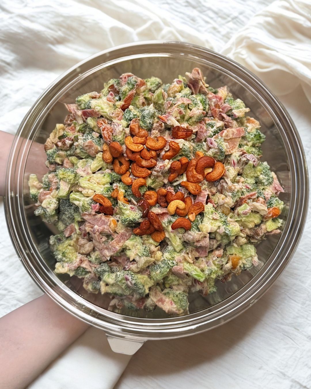 Salaatti sisältää parsakaali, cashew pähkinä, pekoni, majoneesi.