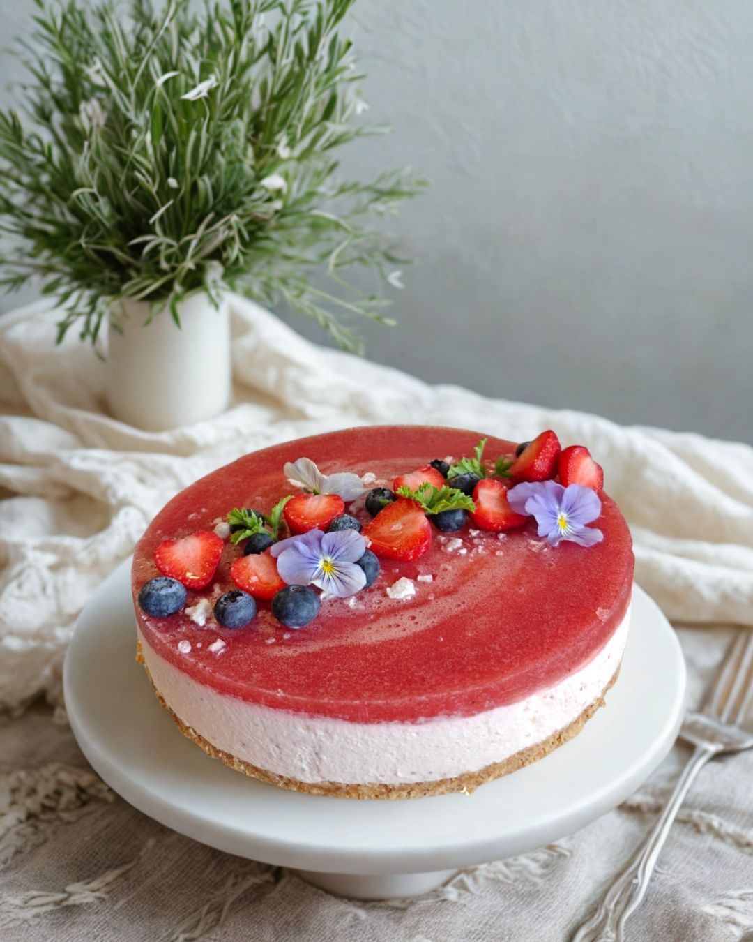 Herkullisen pehmeä tjuustokakku, jossa raikas vadelma ja valkosuklaa kohtaavat kauniilla tavalla.