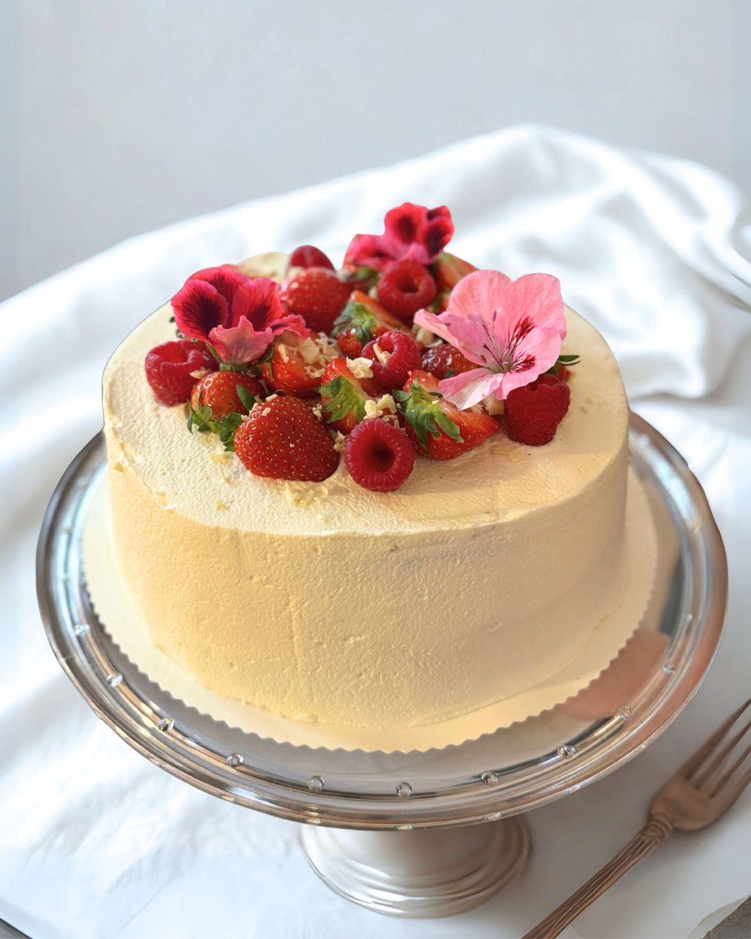Herkullisen pehmeä täytekakku, jossa raikas vadelma ja samettinen valkosuklaa kohtaavat kauniilla tavalla.